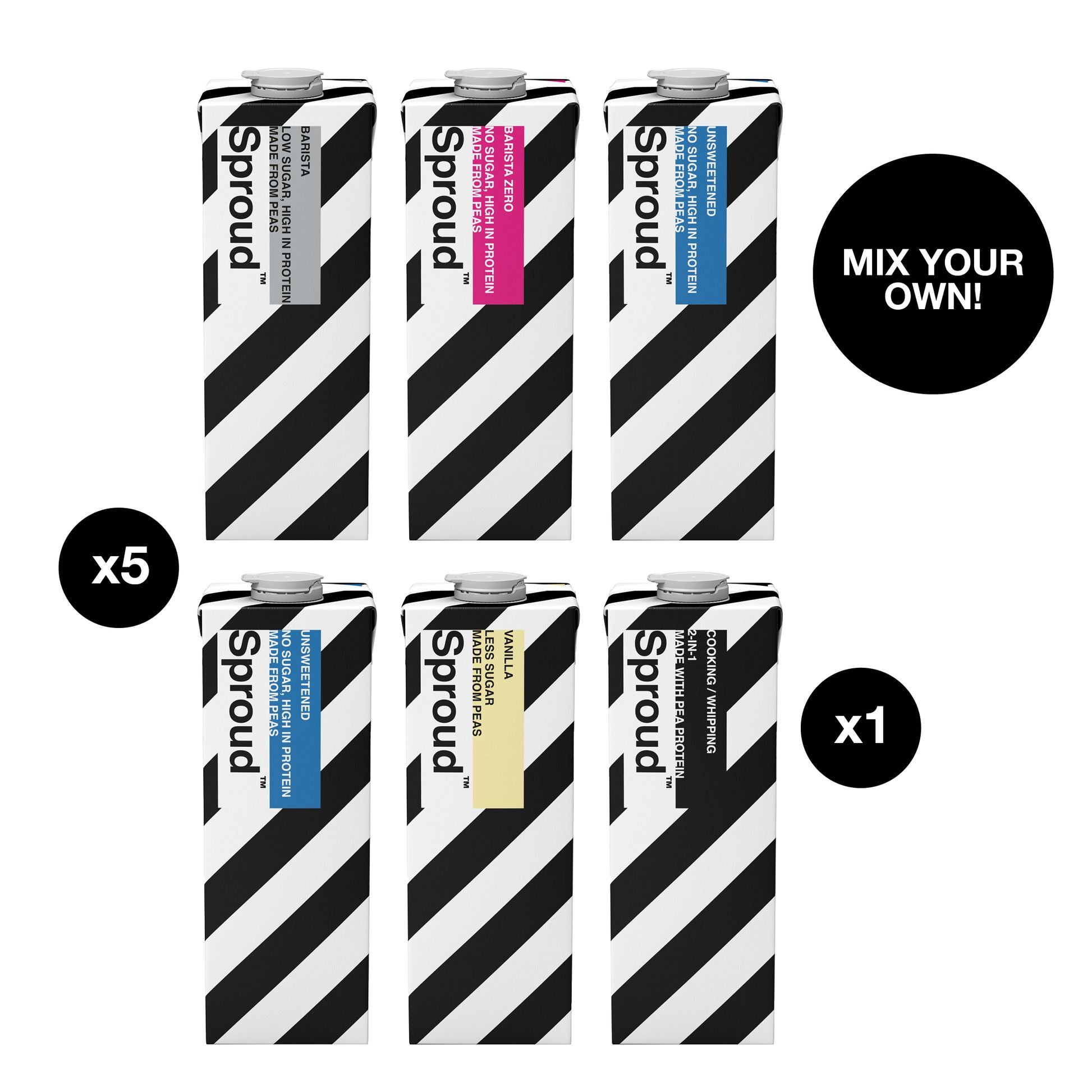 Create your ultimate combination of our alt-alt products. Mix ’N Match a case of any 5 of our 1L plant based milk alternative products - Barista, Unsweetened, Vanilla, or our Barista Zero plus 1 of our NEW Cooking / Whipping 1L.